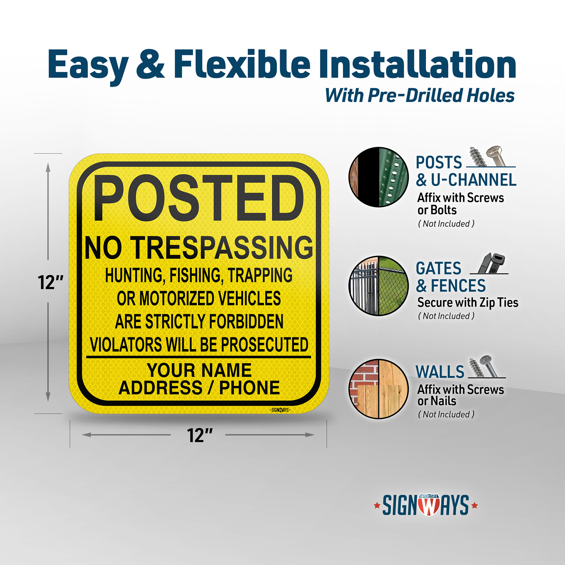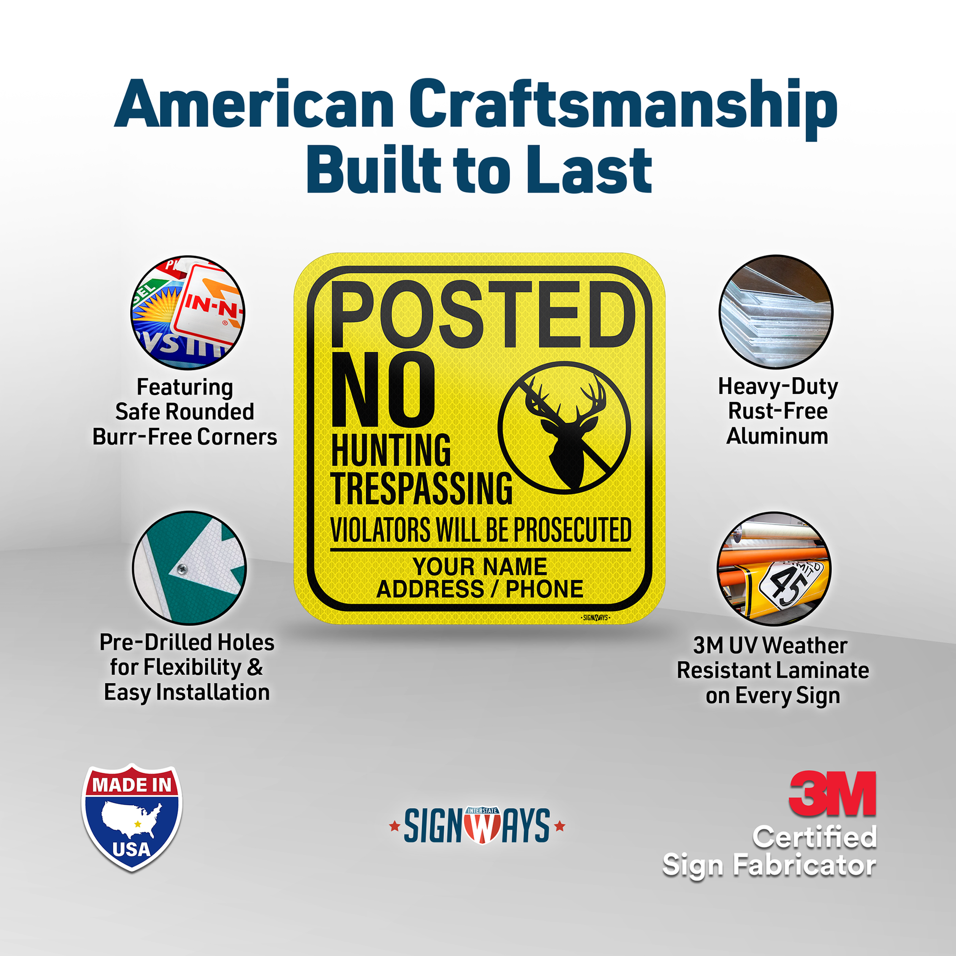Customizable No Hunting or Trespassing Signs | Yellow / Black 12x12”