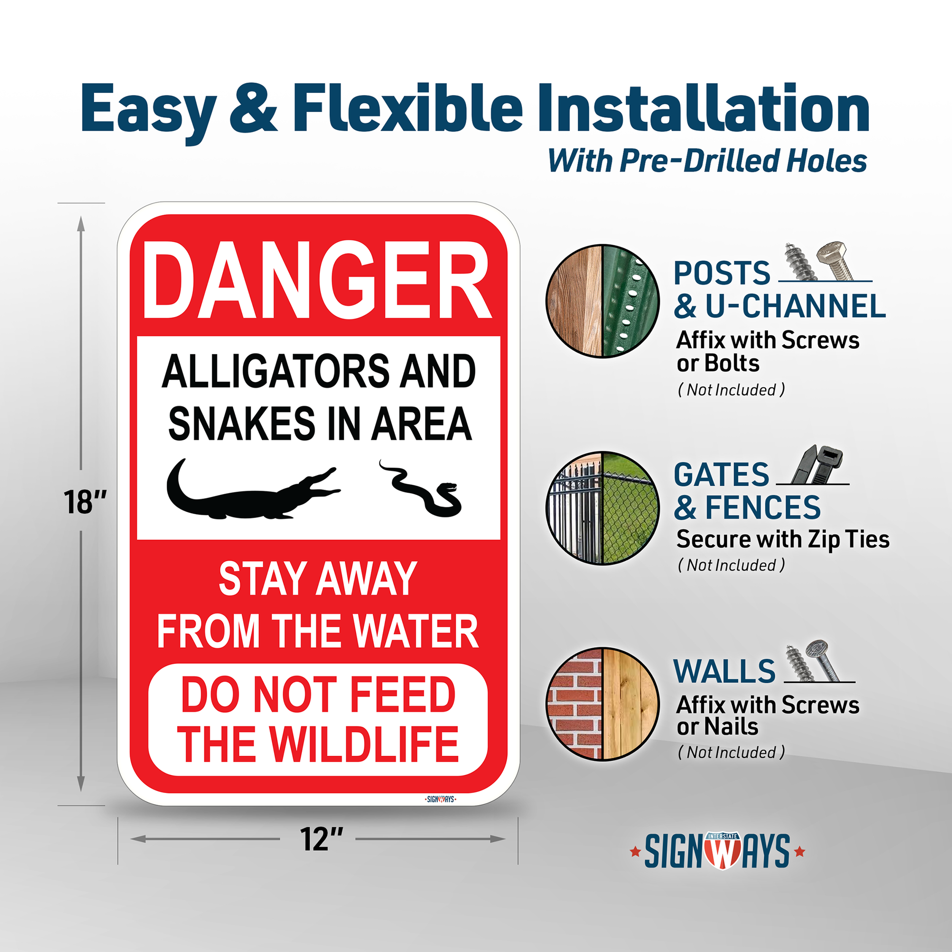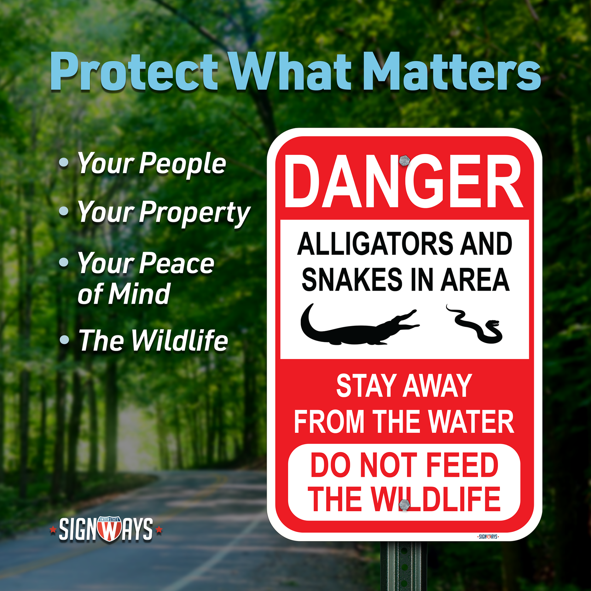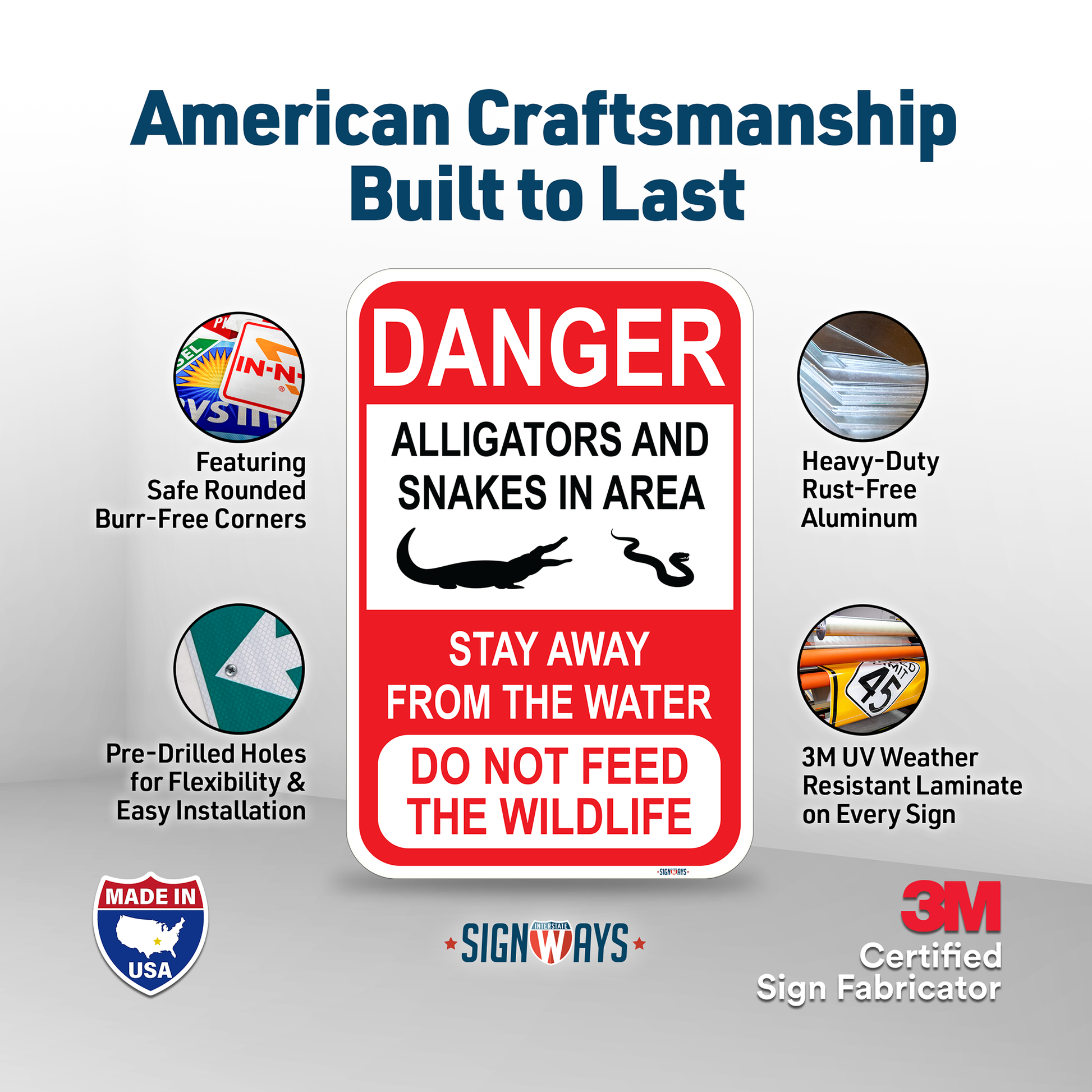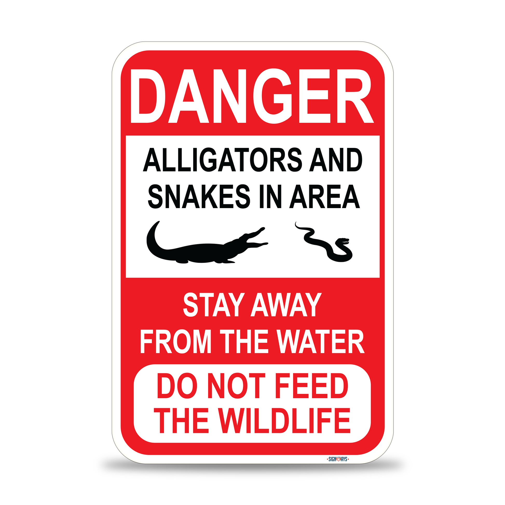 SignWays Danger Alligators and Snakes in Area, Stay Away From Water, Do Not Feed Wildlife Sign