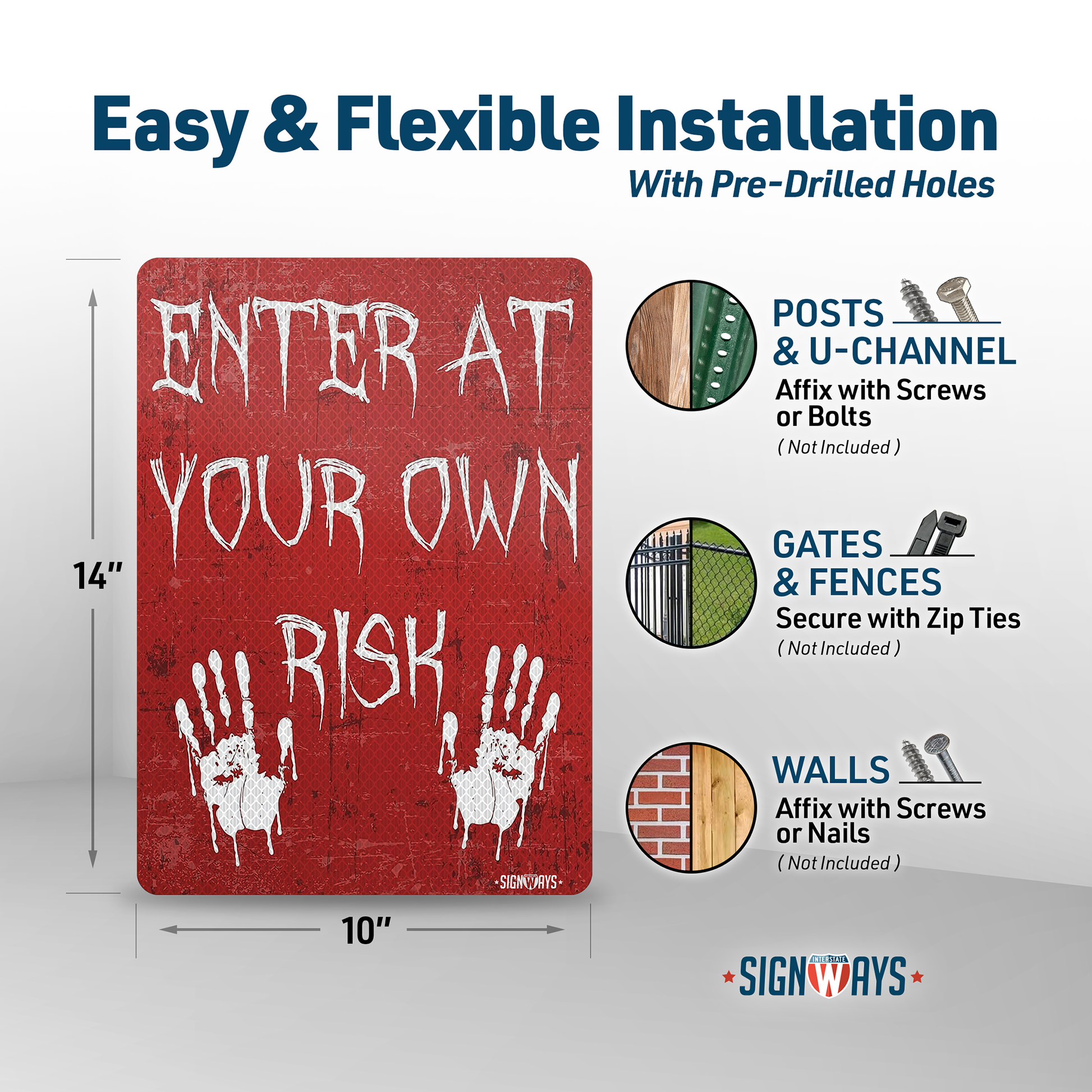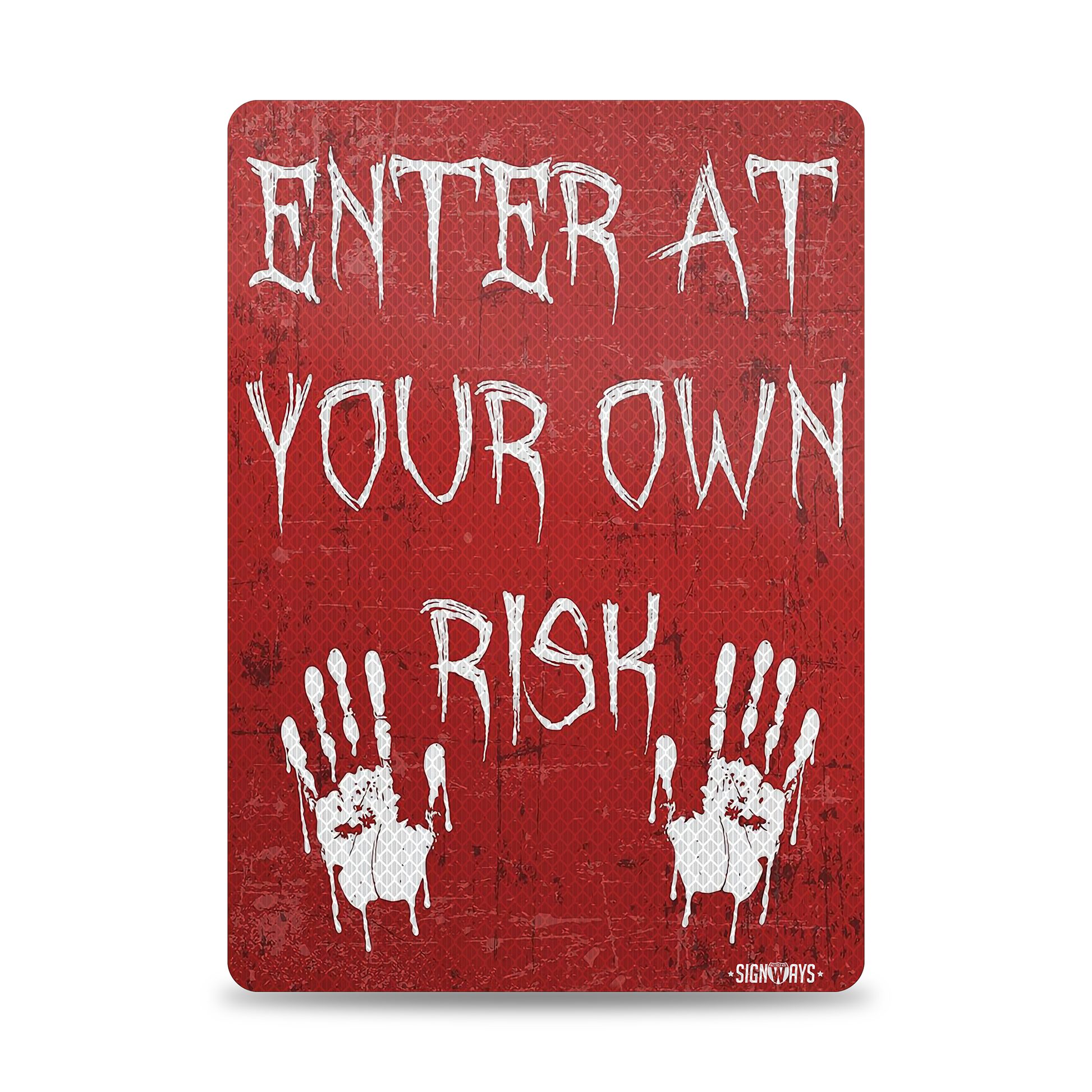 Outdoor Halloween Yard Signs: Enter At Your Own Risk Aluminum Red 14x10”