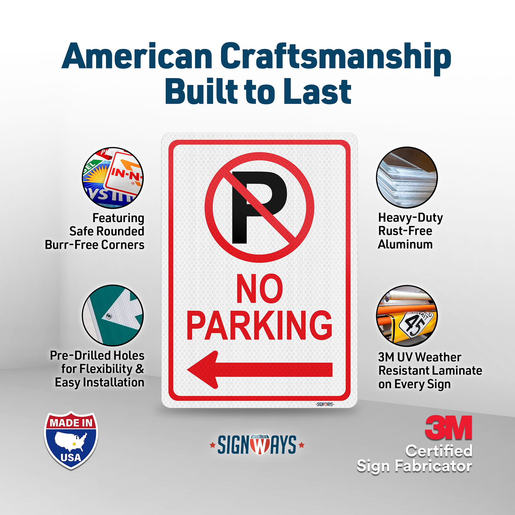 No Parking Sign Aluminum (Left Arrow w Symbol) | 3M Grade Aluminum Reflective | Weather-Proof | Made in USA